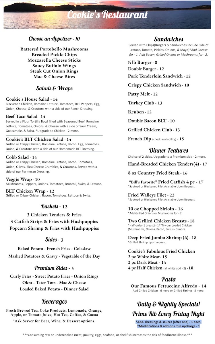 I have only utilized the restaurant here- Cookies. I love it. The food is great, the view of the lake is great and the carrot cake is to die for. The wait staff is always cheerful and helpful. You will feel like you've gone home to homemade food and deserts. The marina and cabins look well cared for, but I have no experience with them